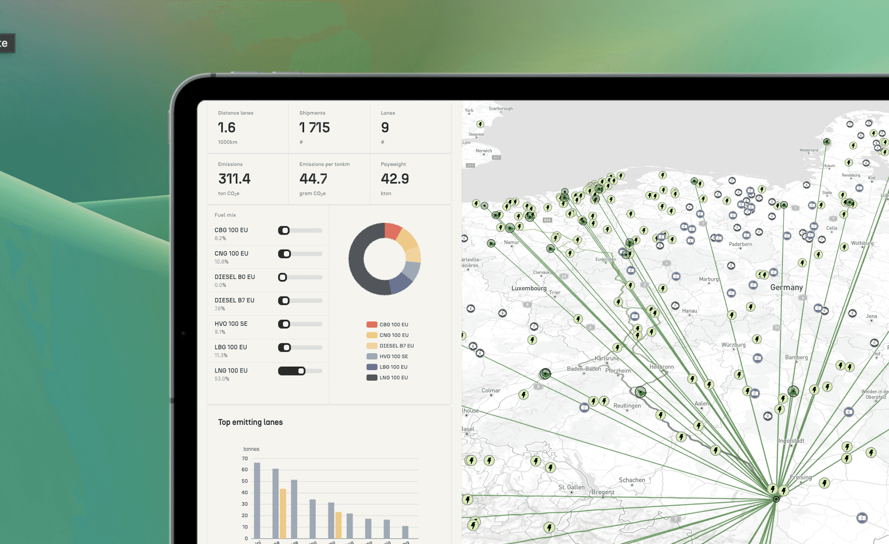 Upload your transport data and instantly see your CO₂ footprint. Then test what happens if you switch routes to electric or biofuel. Clear numbers, no guesswork.
