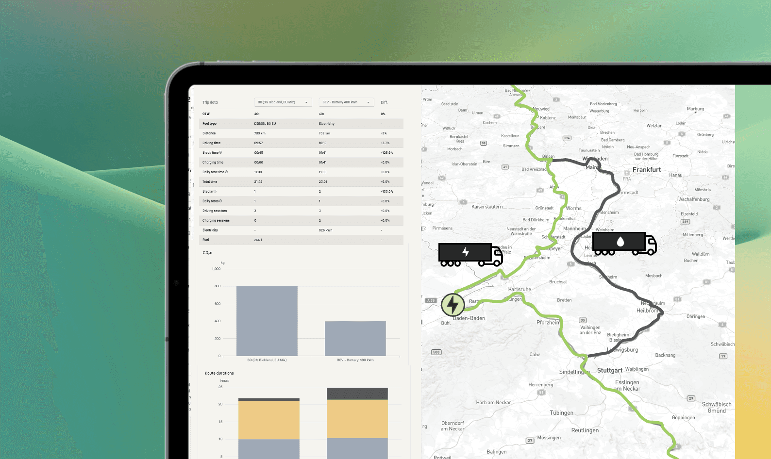 Run side-by-side scenarios to compare electric, biofuel, and traditional options. See the route, charging, cost, CO₂, and lead time of each choice at a glance.